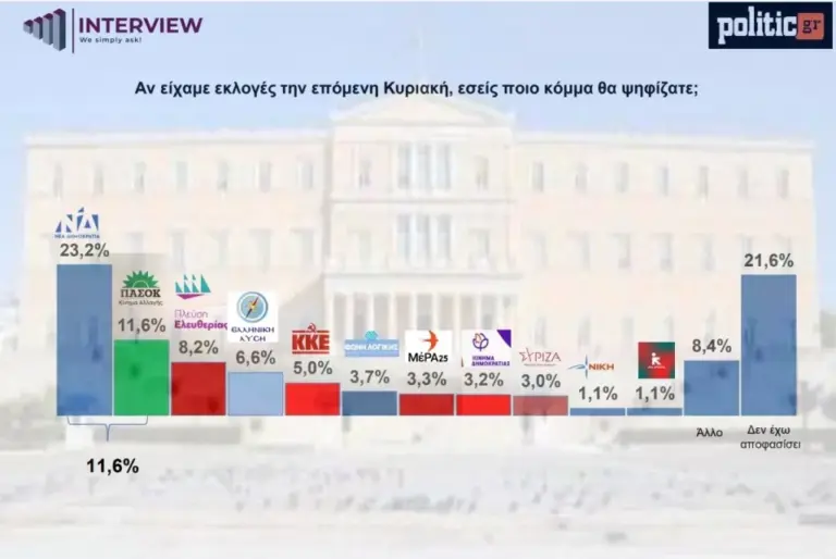 Σταθερό προβάδισμα, ρευστό το τοπίο: Η Νέα Δημοκρατία προηγείται με 23,2%, ακολουθούν το ΠΑΣΟΚ (11,6%) και η Πλεύση Ελευθερίας (8,2%), όμως το 21,6% των αναποφάσιστων διατηρεί ανοιχτό το πολιτικό αποτέλεσμα.