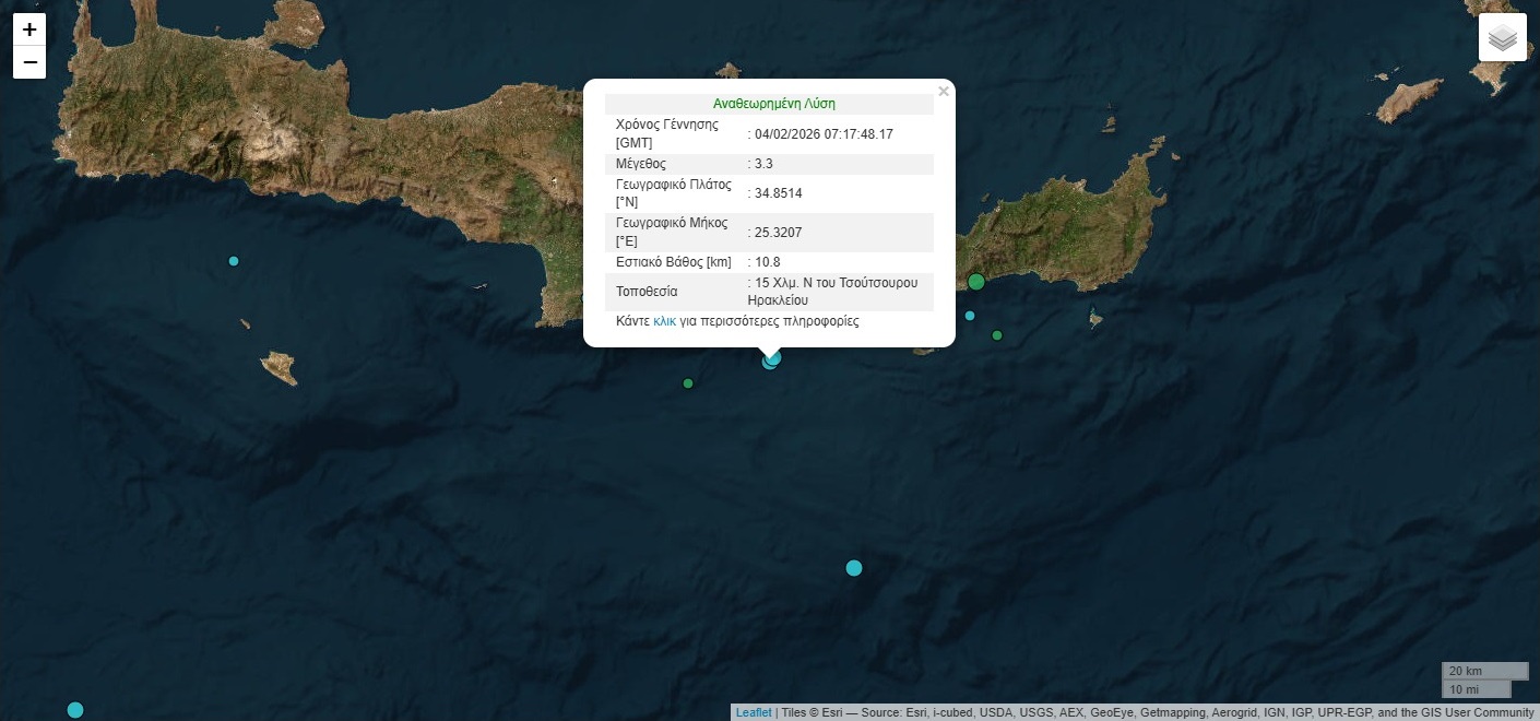 3️⃣2️⃣ 🟠 Σεισμός M 3.2, 04/02 09:17, βάθος 5 χλμ, 45 χλμ ΝΔ από Ιεράπετρα.