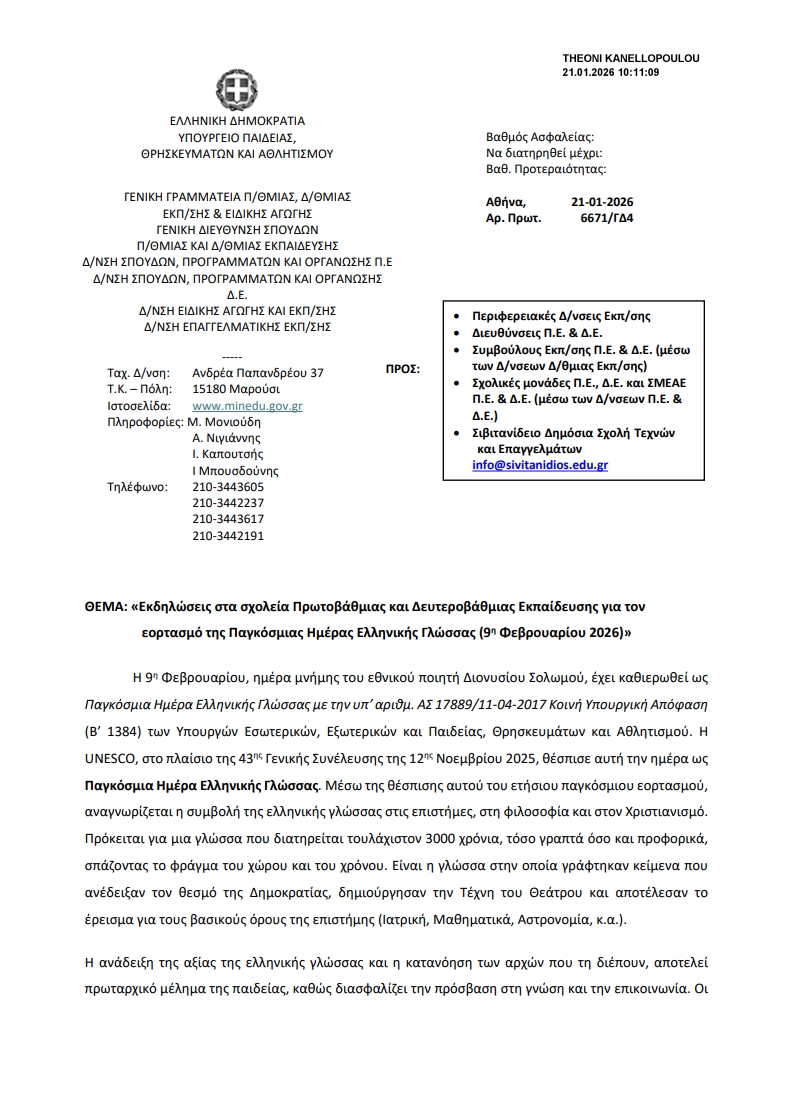 Τη Δευτέρα 9 Φεβρουαρίου οι μαθητές όλων των τάξεων θα δουν μια αλλαγή στο πρόγραμμα μαθημάτων, καθώς με εγκύκλιο του Υπουργείου καλούνται να υλοποιήσουν εκπαιδευτικές δραστηριότητες και να συμμετάσχουν ενεργά σε αφιερώματα για τον πλούτο και τη διαχρονικότητα της ελληνικής γλώσσας, προάγοντας τη γνώση, την αγάπη για τον πολιτισμό και την ιστορία.