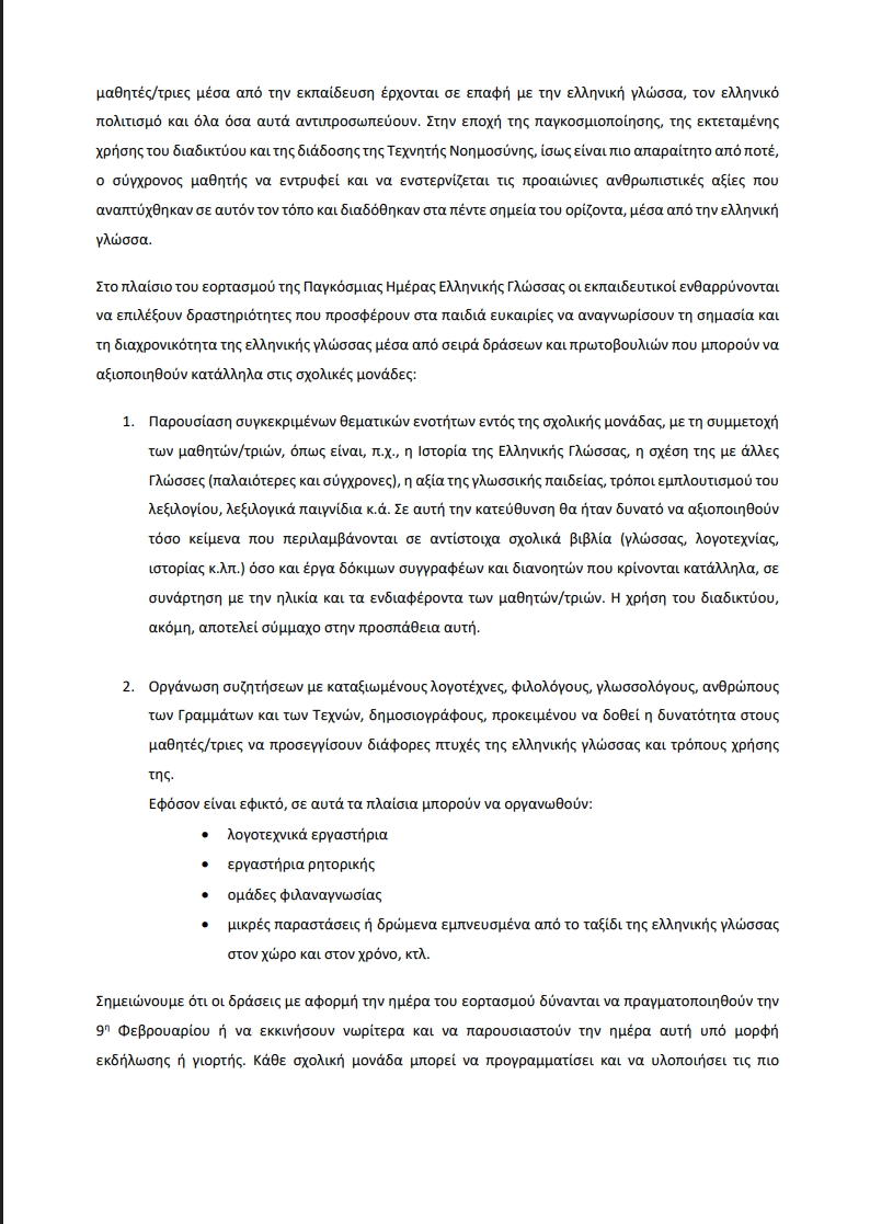 Στην σχετική εγκύκλιο του Υπουργείου προτείνεται στα σχολεία Πρωτοβάθμιας και Δευτεροβάθμιας να υλοποιηθούν μεταξύ άλλων θεματικές παρουσιάσεις για την ιστορία και τη σημασία της ελληνικής γλώσσας, τη σχέση της με άλλες γλώσσες και τρόπους εμπλουτισμού του λεξιλογίου, εργαστήρια με λογοτέχνες, φιλολόγους και γλωσσολόγους καθώς και λογοτεχνικά εργαστήρια, ομάδες φιλαναγνωσίας, μικρές παραστάσεις ή δρώμενα εμπνευσμένα από την ιστορική πορεία της γλώσσας.
