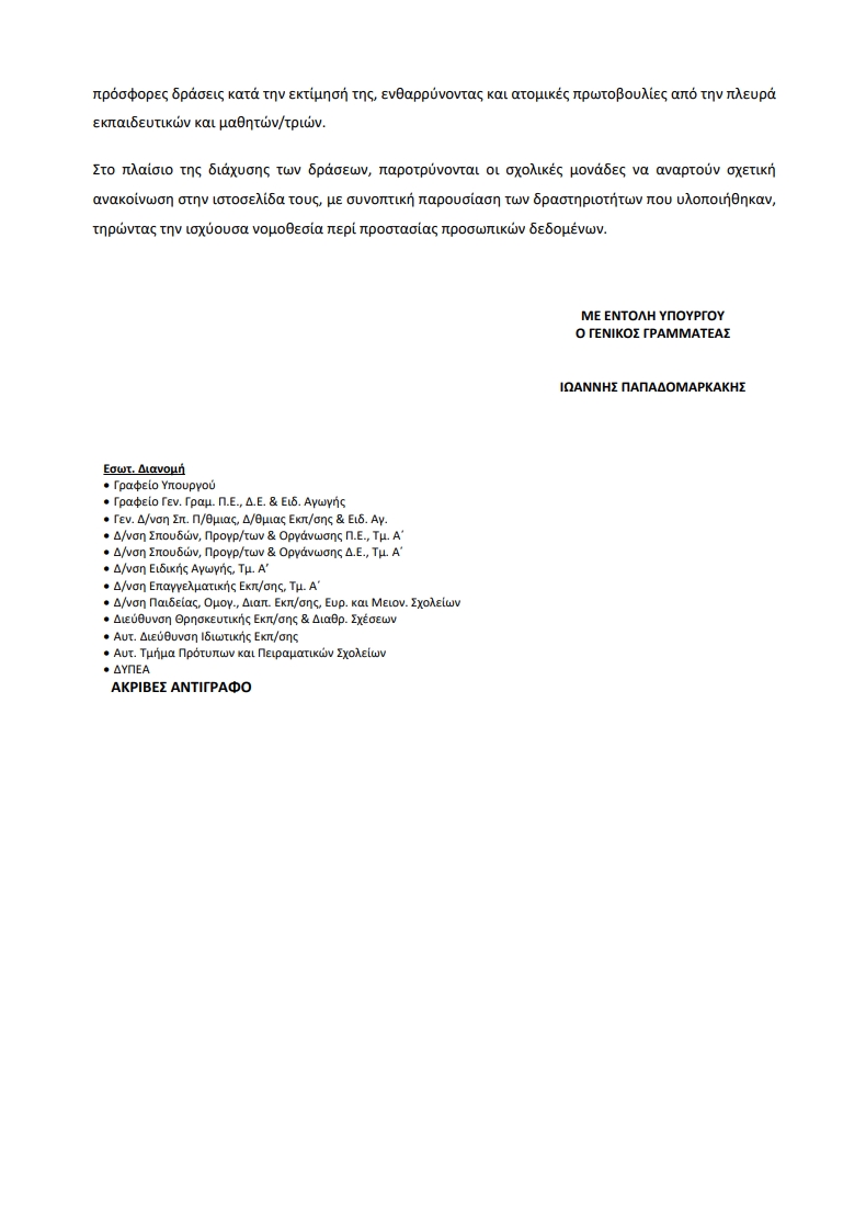 Οι σχολικές μονάδες μπορούν να προγραμματίσουν τις δραστηριότητες κατάλληλα, είτε την ίδια την ημέρα είτε νωρίτερα, με παρουσίαση υπό μορφή εκδήλωσης ή σχολικής γιορτής, ενθαρρύνοντας τόσο την ατομική όσο και τη συλλογική συμμετοχή μαθητών και εκπαιδευτικών.