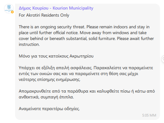 Συγκεκριμένα, στους κατοίκους του Ακρωτηρίου στάλθηκε η ενημέρωση πως «υπάρχει σε εξέλιξη απειλή ασφάλειας».