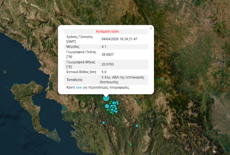Σεισμός μεγέθους 4 βαθμών της κλίμακας Ρίχτερ σημειώθηκε στις 19:24 το απόγευμα του Σαββάτου (4/4) στη Θεσπρωτία, προκαλώντας δόνηση που έγινε αισθητή στην ευρύτερη περιοχή.
