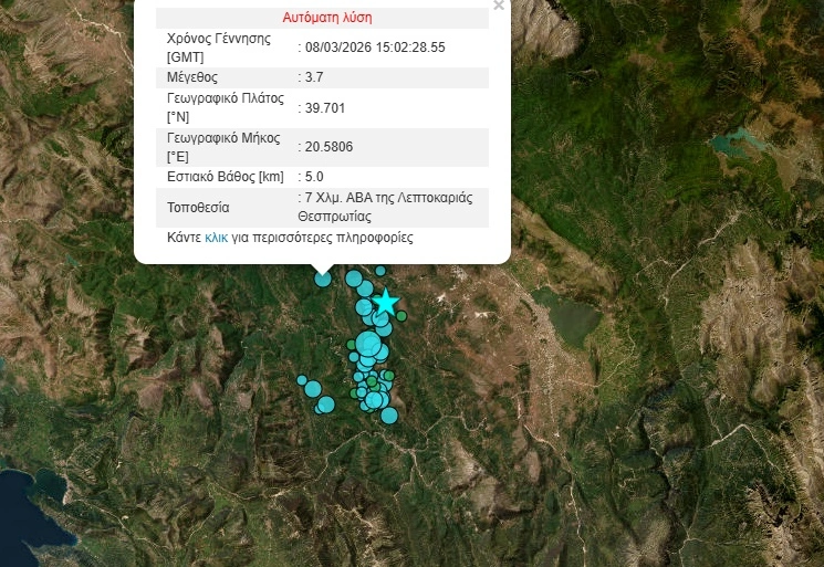 Ο μετασεισμός σημειώθηκε στις 17:02 το απόγευμα της Κυριακής (8/3). Σύμφωνα με την αυτόματη λύση του Γεωδυναμικού Ινστιτούτου ο σεισμός είχε ένταση 3,7 Ρίχτερ με το επίκεντρο να σημειώνεται 7χλμ ανατολικά βορειοανατολικά της Λεπτοκαρυάς.