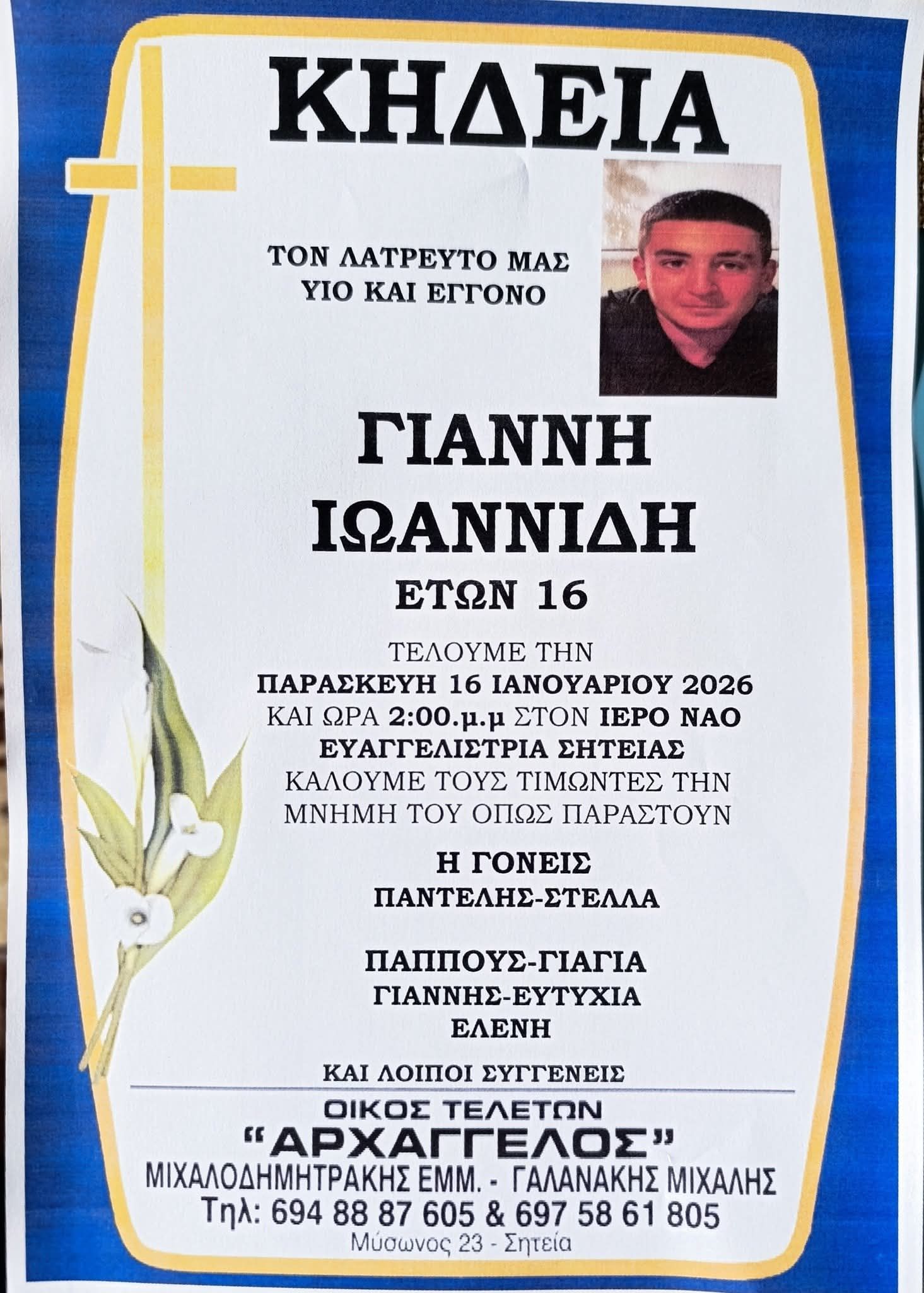 Η εξόδιος ακολουθία του Γιάννη Ιωαννίδη θα τελεστεί την Παρασκευή 16 Ιανουαρίου 2026 και ώρα 14:00, στον Ιερό Ναό Ευαγγελίστριας Σητείας.