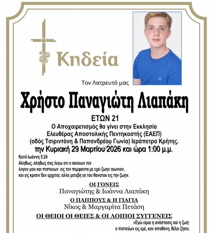 Βαρύ πένθος και ανείπωτη θλίψη έχει σκορπίσει στην τοπική κοινωνία της Ιεράπετρας η είδηση του αιφνίδιου θανάτου του 21χρονου Χρήστου Παναγιώτη Λιαπάκη, που έφυγε τόσο πρόωρα από τη ζωή, αφήνοντας πίσω του ένα δυσαναπλήρωτο κενό.