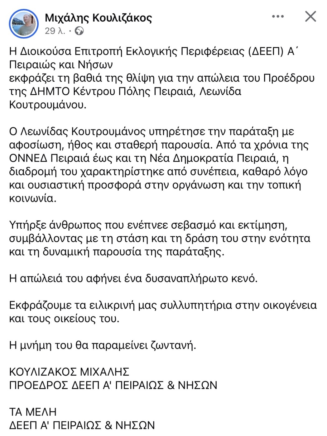 Ενώ σε μια συγκινητική ανάρτηση προχώρησε και ο Προέδρος της Νομαρχιακής Επιτροπής της ΝΔ Α Πειραιά & Νήσων Μιχάλης Κουλιζάκος: