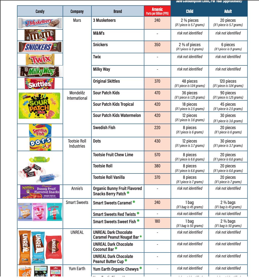 • Sour Patch Kids: 470 ppb, ασφαλές όριο 36 τεμάχια ετησίως για παιδιά και 90 για ενήλικες. • Sour Patch Kids Tropical: 420 ppb, ασφαλές όριο 18 τεμάχια για παιδιά και 45 για ενήλικες. • Sour Patch Kids Watermelon: 420 ppb, ασφαλές όριο 12 τεμάχια ετησίως για παιδιά και 30 για ενήλικες. • Swedish Fish: 220 ppb, ασφαλές όριο 8 τεμάχια για παιδιά και 20 για ενήλικες.