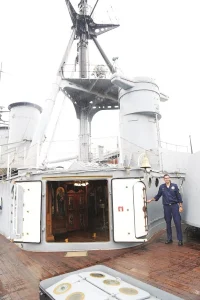 Το εκκλησάκι τοποθετήθηκε στο σημείο που ήταν σχεδιασμένη η πυριταποθήκη. Πρόκειται για το μοναδικό πολεμικό πλοίο με ναό και μάλιστα πάντοτε υπηρετούσε ιερέας, που ήταν ο τρίτος στην αρχαιότητα σε βαθμό.