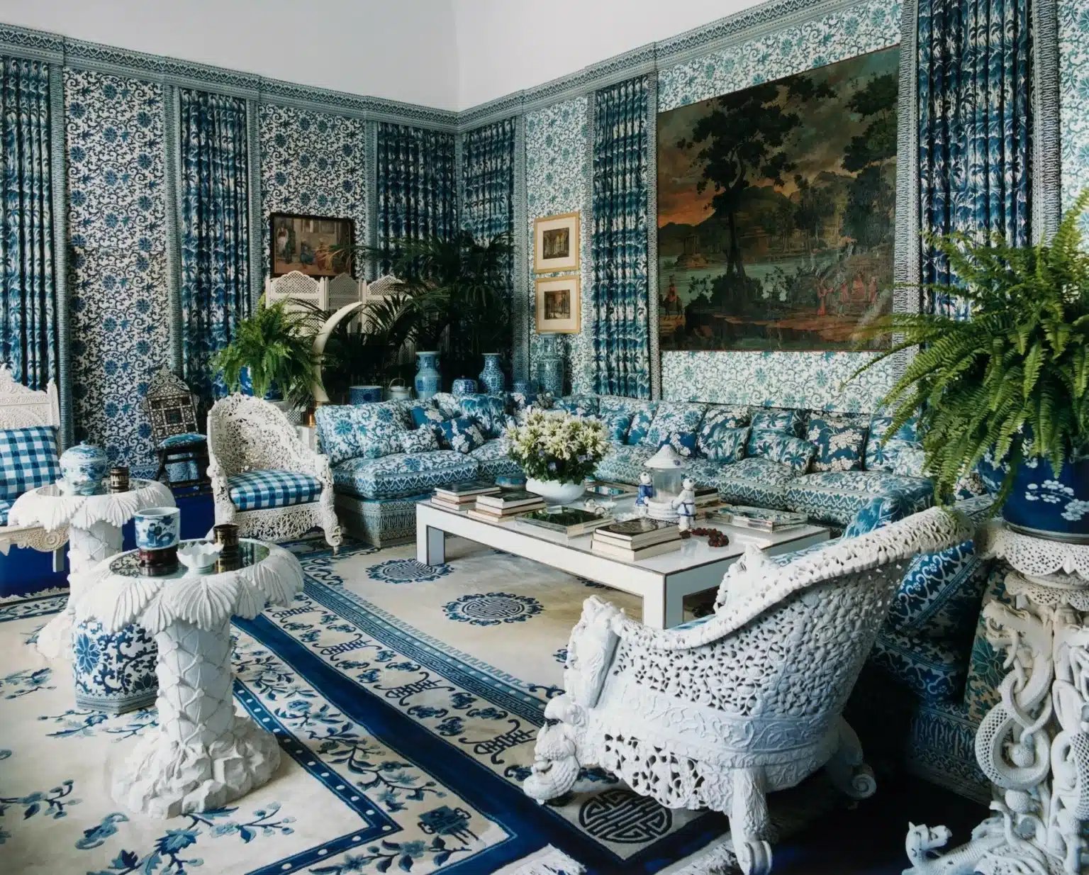 Τα σπίτια του Βαλεντίνο, ίσως περισσότερο κι από τα φορέματα και τις τουαλέτες, αποτελούν την πιο τέλεια έκφραση του ίδιου του εαυτού του, επειδή έχουν δημιουργηθεί για την προσωπική του ευχαρίστηση. Το σαλόνι της βίλας του στο Capri. Φωτ.: Getty Images/ Ideal Image