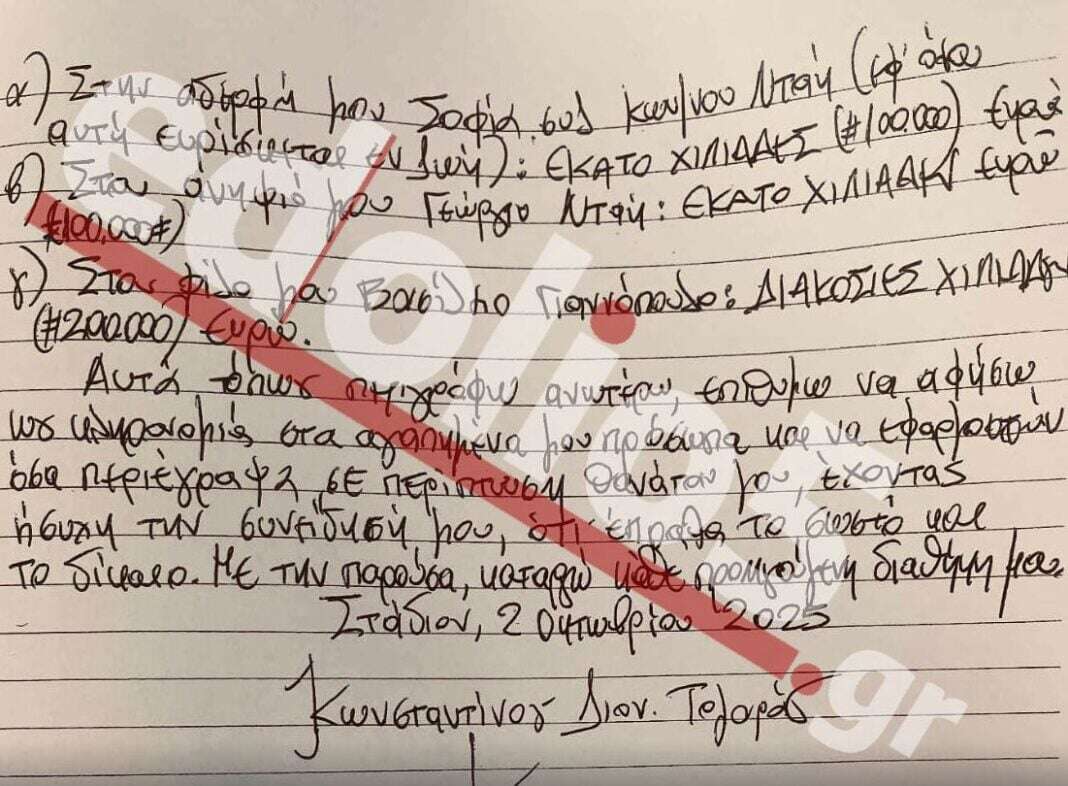 Σύμφωνα με τα έγγραφα, κατονομάζονται τρεις βασικοί κληρονόμοι, στους οποίους αφήνει δεκάδες παραλιακά στρέμματα και εκατοντάδες χιλιάδες ευρώ σε μετρητά, ενώ άλλα πρόσωπα του στενού του κύκλου μένουν εκτός, προκαλώντας ερωτήματα και εντάσεις.