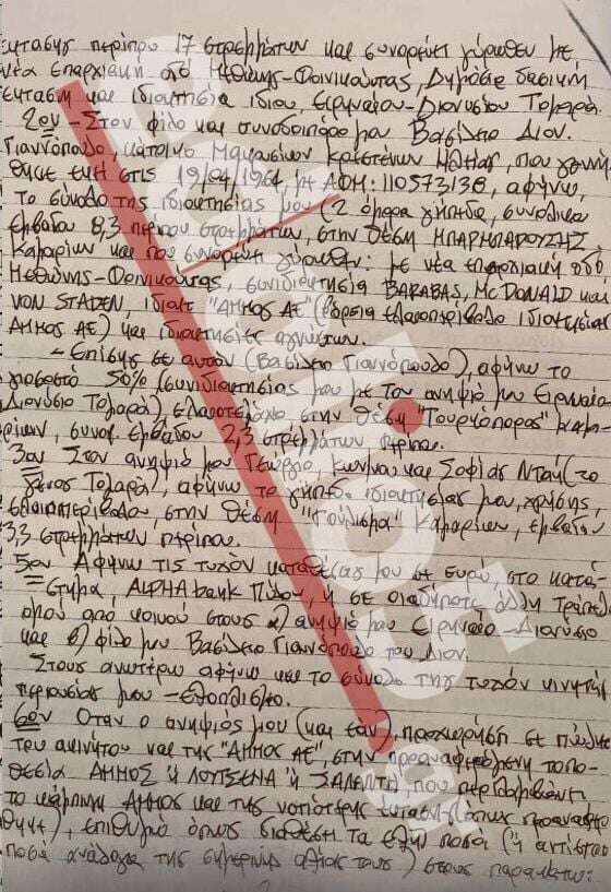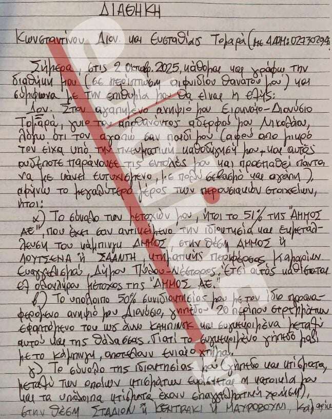 Αυτή είναι η διαθήκη που κρύβει τους φυσικούς και ηθικούς αυτουργούς της εκτέλεσης – Έγραψε τη διαθήκη του τρεις μέρες πριν δολοφονηθεί – Εpωτικά και οικονομικά κίνητρα η διπλή δολοφονία στη Μεσσηνία που παραμένει άλυτος γρίφος