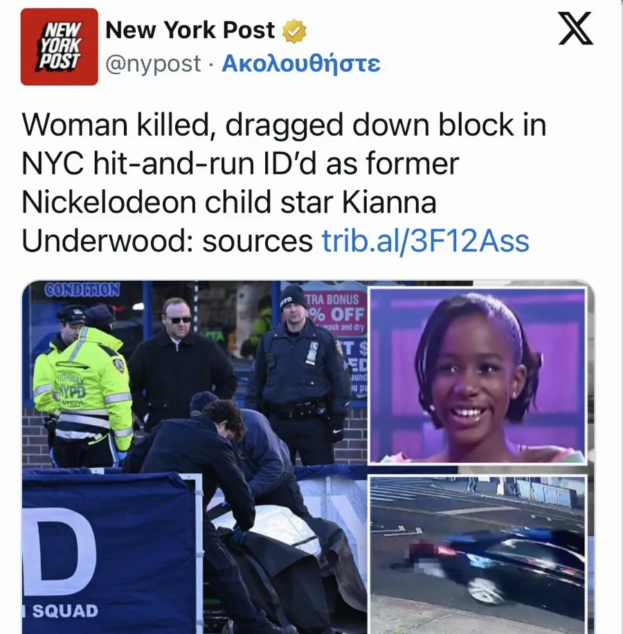 Θύμα τροχαίου με εγκατάλειψη έπεσε το πρωί της Παρασκευής στο Μπρούκλιν η Κιάνα Άντεργουντ, πρώην παιδική σταρ του Nickelodeon, η οποία σκοτώθηκε όταν παρασύρθηκε από όχημα και σύρθηκε για περίπου ένα τετράγωνο, σύμφωνα με την αστυνομία της Νέας Υόρκης.