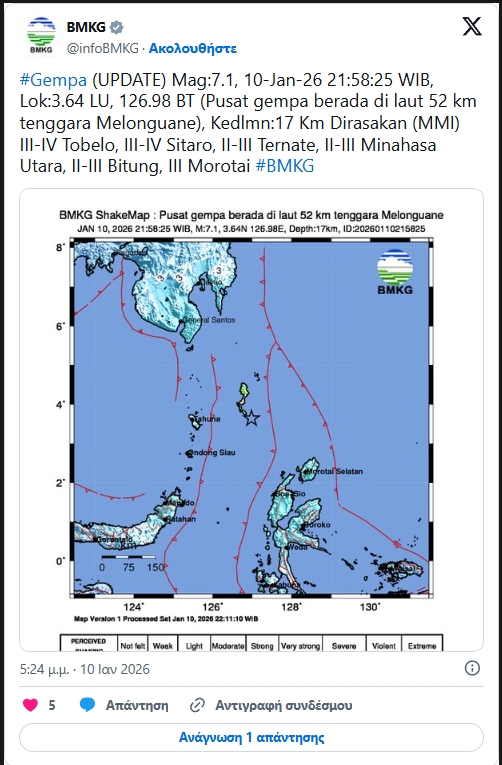 Ισχυρός σεισμός, μεγέθους 7,1 Ρίχτερ, σημειώθηκε το Σάββατο (10/01) στη νοτιοανατολική περιοχή του Μελονγκουάν, στην περιφέρεια των Νήσων Ταλάουν, στη Βόρεια Σουλαουέσι της Ινδονησίας.