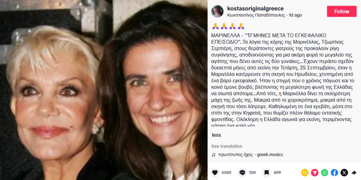 Η είδηση για την κατάσταση της υγείας της μεγάλης κυρίας του ελληνικού τραγουδιού συνεχίζει να συγκλονίζει το πανελλήνιο, καθώς νέες λεπτομέρειες έρχονται στο φως της δημοσιότητας. Σε ένα βίντεο από το TikTok που κυκλοφόρησε τις τελευταίες ώρες από τον λογαριασμό @kostasoriginalgreece, περιγράφεται η δραματική καθημερινότητα της Μαρινέλλας, 17 μήνες μετά το μοιραίο βράδυ στο Ηρώδειο. Οι εικόνες και οι πληροφορίες που μεταφέρονται μέσα από την πλατφόρμα προκαλούν ρίγη συγκίνησης, εστιάζοντας στην τιτάνια προσπάθεια της οικογένειάς της να διαχειριστεί μια κατάσταση που μοιάζει αμετάκλητη, αλλά και στην ακλόνητη αγάπη που περιβάλλει τη Μαρινέλλα σε αυτή την τελευταία, δύσκολη διαδρομή.