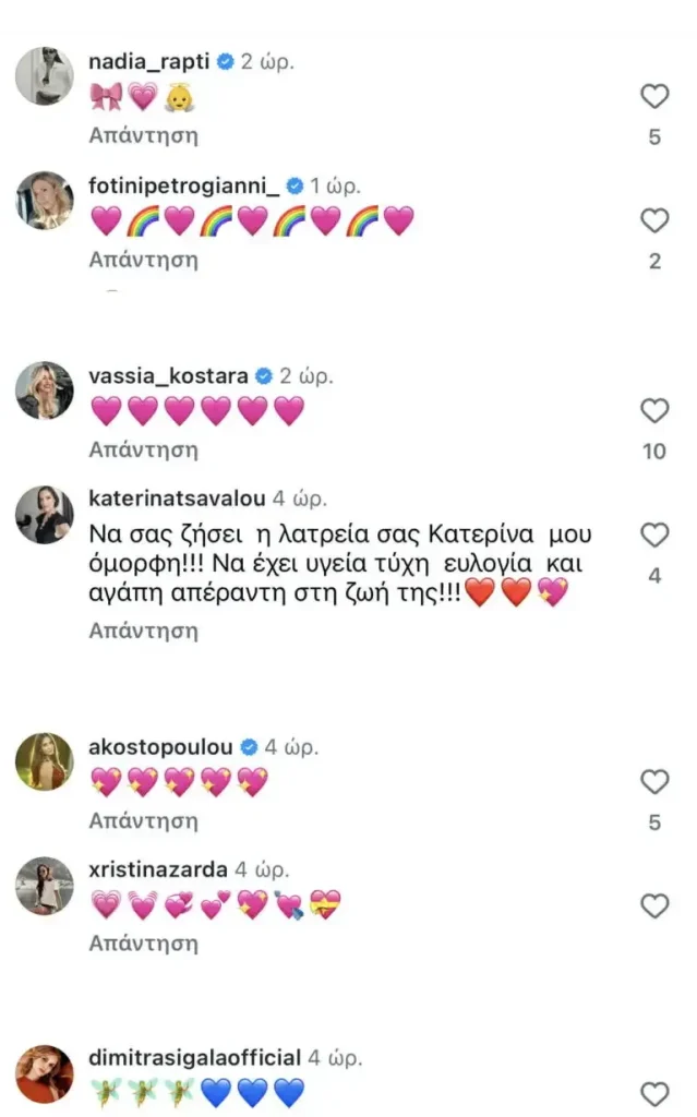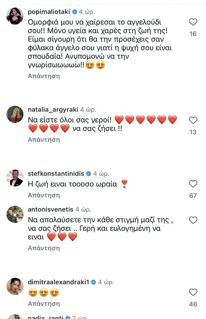 Όπως ήταν αναμενόμενο, η δημοσίευσή της συγκέντρωσε πλήθος σχολίων, με φίλους, συνεργάτες αλλά και διαδικτυακούς της φίλους να της στέλνουν ευχές και μηνύματα αγάπης.