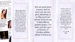 Θα ήθελα να ξέρετε όλοι, εσείς οι γνωστοί και οι άγνωστοι φίλοι μου, πως είμαι καλά εστιάζω στη δουλειά και τον εαυτό μου και συνεχίζω να κοιτάω μπροστά και να προχωράω. Μου λείπετε όλοι τόσο και εύχομαι κάποια στιγμή να καταφέρω να βρεθώ ξανά κοντά σας έστω και για λίγο. Σας εύχομαι ολόψυχα καλές γιορτές. Σας αγαπώ. Μάρω»