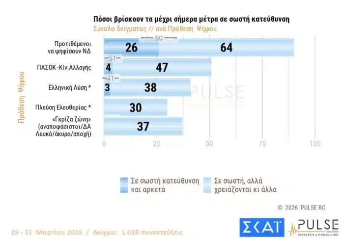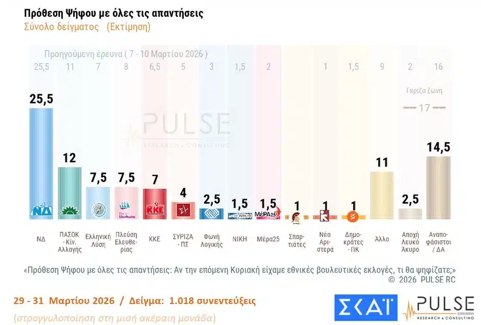 H ΝΔ φτάνει περίπου στο 31% και έχει διαφορά 16,5 μονάδες από το δεύτερο κόμμα σύμφωνα με την νέα δημοσκόπηση της Pulse για λογαριασμό του ΣΚΑΪ.