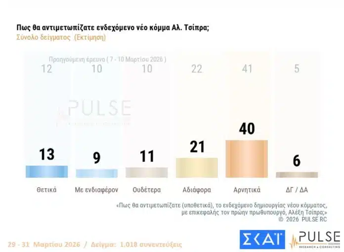 Στο 13%, μία μονάδα πάνω σε σχέση με τον προηγούμενο μήνα, είναι αυτοί που βλέπουν θετικά ένα κόμμα από τον Αλέξη Τσίπρα. Μία μονάδα κάτω (στο 9%, από 10%) είναι όσοι βλέπουν με ενδιαφέρον το κόμμα. Αδιάφορα ή αρνητικά το βλέπει το 61% των πολιτών.