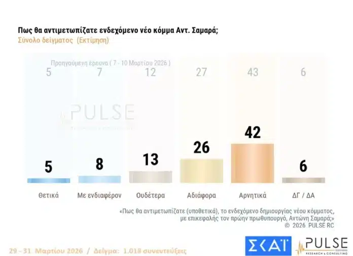 Στο ενδεχόμενο νέου κόμματος από τον Αντώνη Σαμαρά, θετικά ή με ενδιαφέρον το βλέπει το 13%.