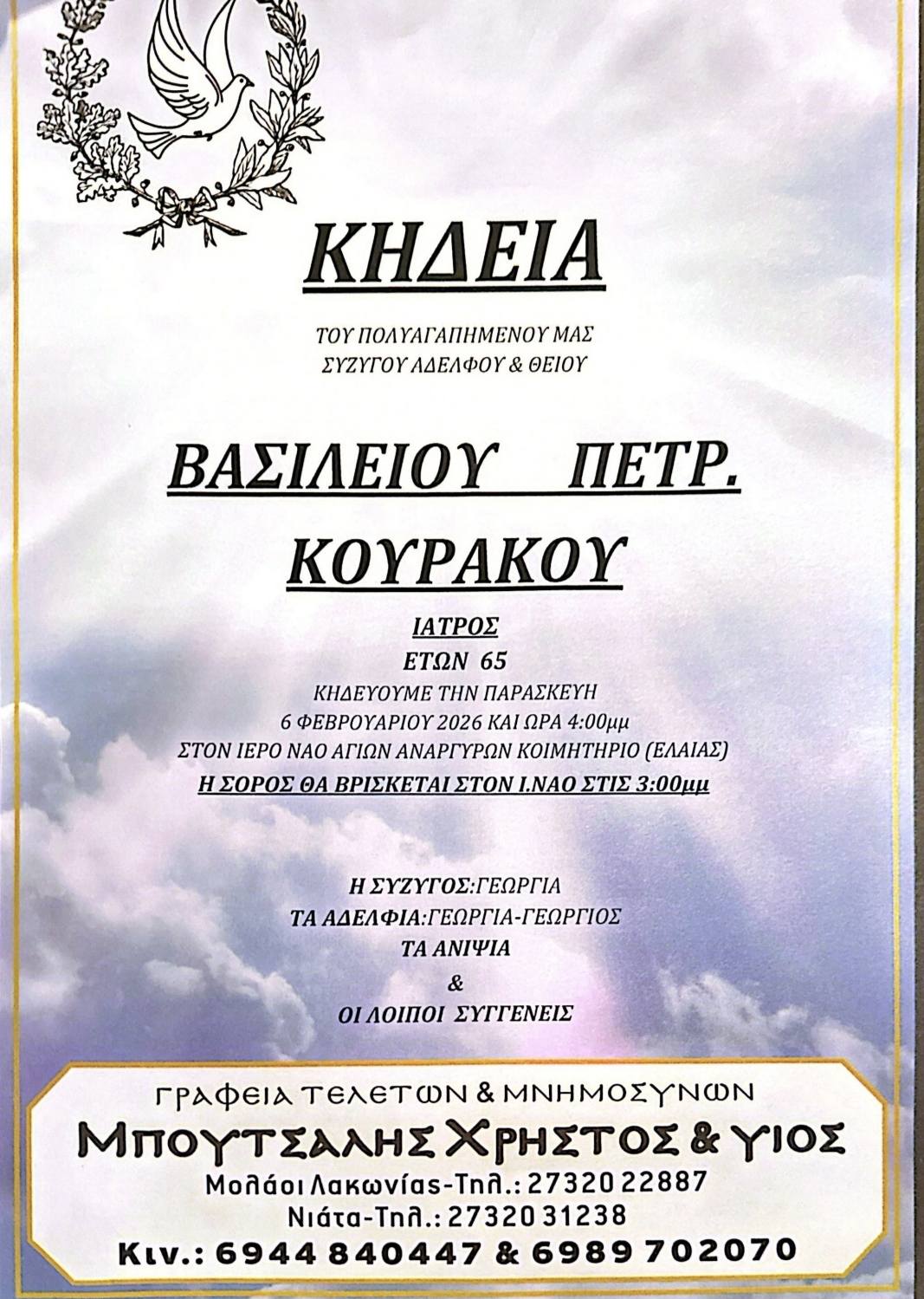 Η νεκρώσιμη ακολουθία θα τελεστεί την Παρασκευή 6 Φεβρουαρίου 2026 και ώρα 16:00 στον Ιερό Ναό Αγίων Αναργύρων στην Ελαία Λακωνίας.