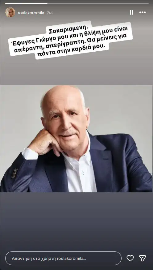 «Σοκαρισμένη. Έφυγες Γιώργο μου και η θλίψη μου είναι απέραντη, απερίγραπτη. Θα μείνεις πάντα στην καρδιά μου», έγραψε η Ρούλα Κορομηλά.