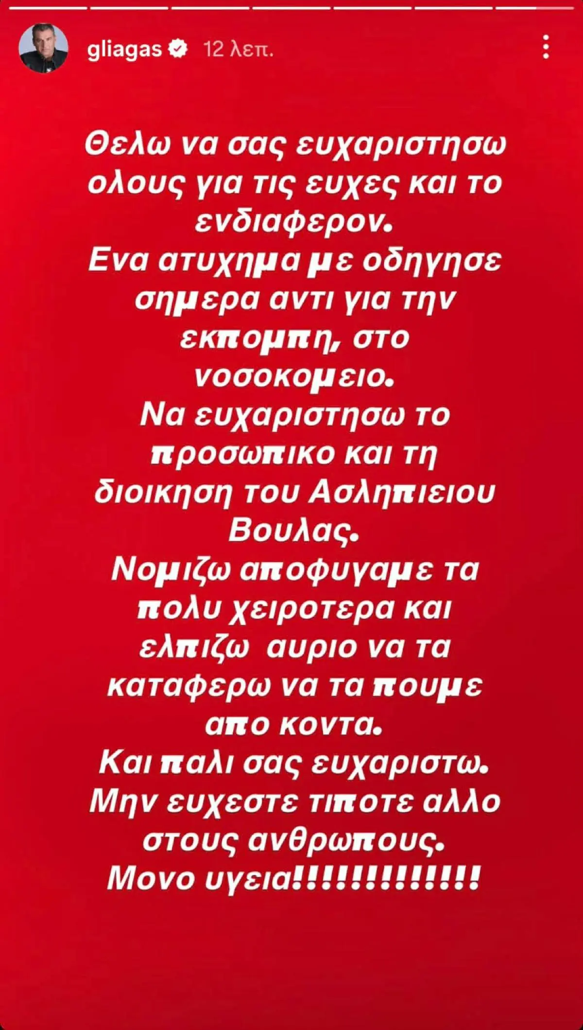 Ο παρουσιαστής με ανάρτησή του το απόγευμα της ίδιας μέρας, ευχαρίστησε δημόσια για τις ευχές που δέχτηκε μετά το ατύχημά του και έγραψε συγκεκριμένα: «Θέλω να σας ευχαριστήσω όλους για τις ευχές και το ενδιαφέρον. Ένα ατύχημα με οδήγησε σήμερα αντί για την εκπομπή στο νοσοκομείο. Να ευχαριστήσω το προσωπικό και τη διοίκηση του Ασκληπιείου Βούλας. Νομίζω αποφύγαμε τα πολύ χειρότερα και ελπίζω αύριο να τα καταφέρω να τα πούμε από κοντά. Και πάλι σας ευχαριστώ. Μην εύχεστε τίποτε άλλο στους ανθρώπους. Μόνο υγεία!»