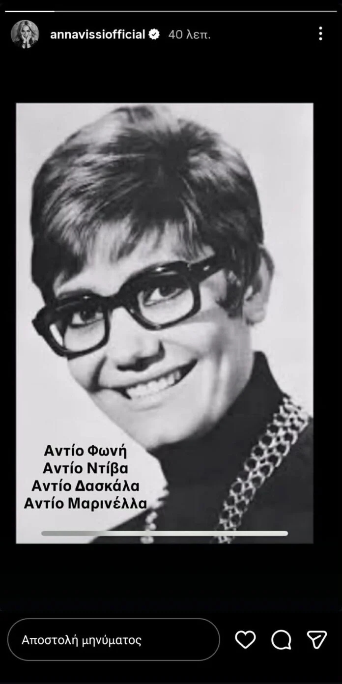 Μέσα σε αυτό το κλίμα συγκίνησης, η Άννα Βίσση επέλεξε έναν απόλυτα προσωπικό και λιτό τρόπο για να πει το δικό της «αντίο». Πιο συγκεκριμένα, η ίδια δημοσίευσε μια ασπρόμαυρη φωτογραφία της Μαρινέλλας από τα νεότερά της χρόνια και έγραψε πάνω της: «Αντίο φωνή, αντίο ντίβα, αντίο δασκάλα, αντίο Μαρινέλλα».