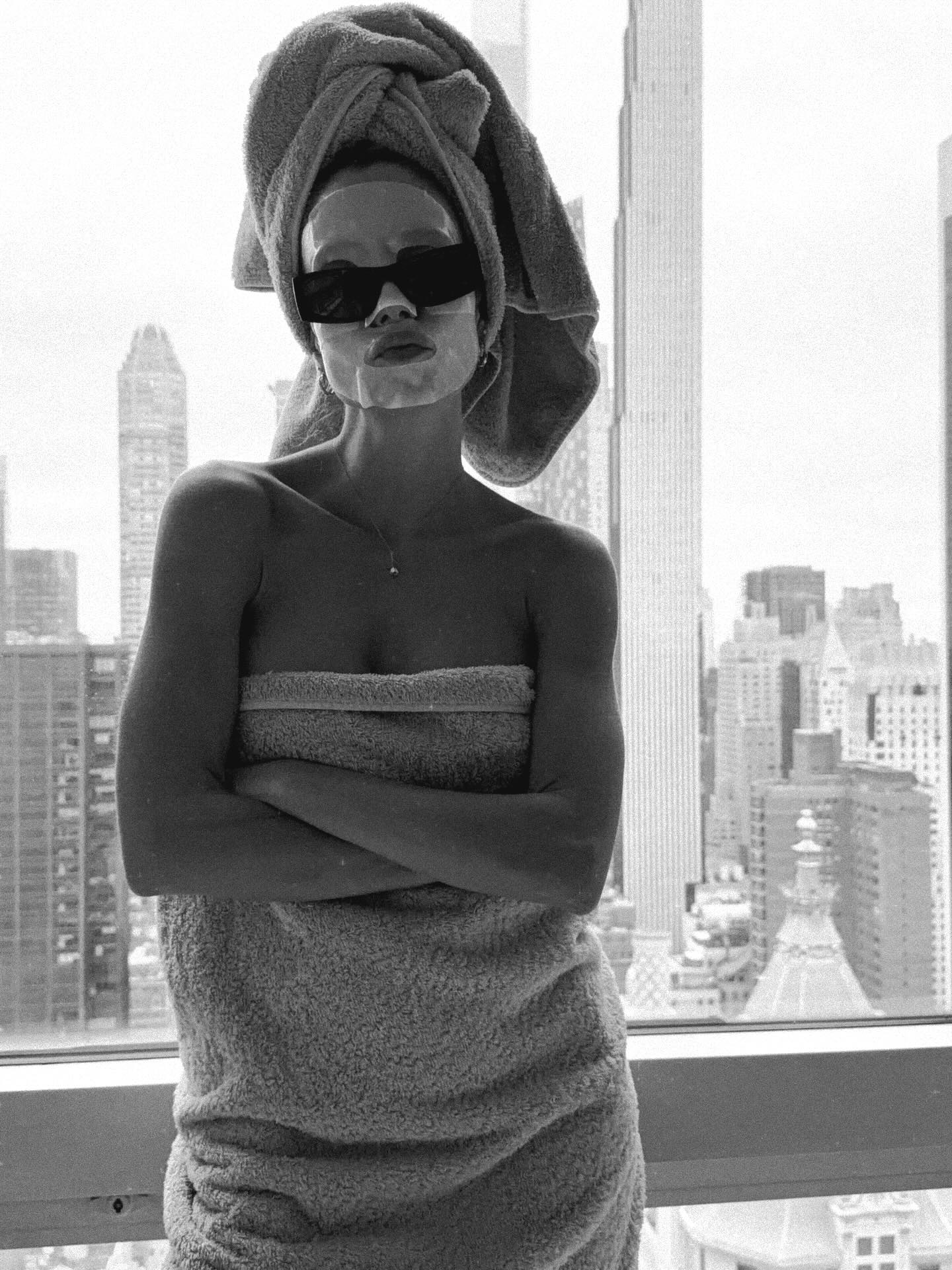 Μέσα από αναρτήσεις στον λογαριασμό της στο Instagram εμφανίζεται σε στιγμές χαλάρωσης στο δωμάτιο του ξενοδοχείου της, χωρίς ίχνος μακιγιάζ και τυλιγμένη με μια πετσέτα.