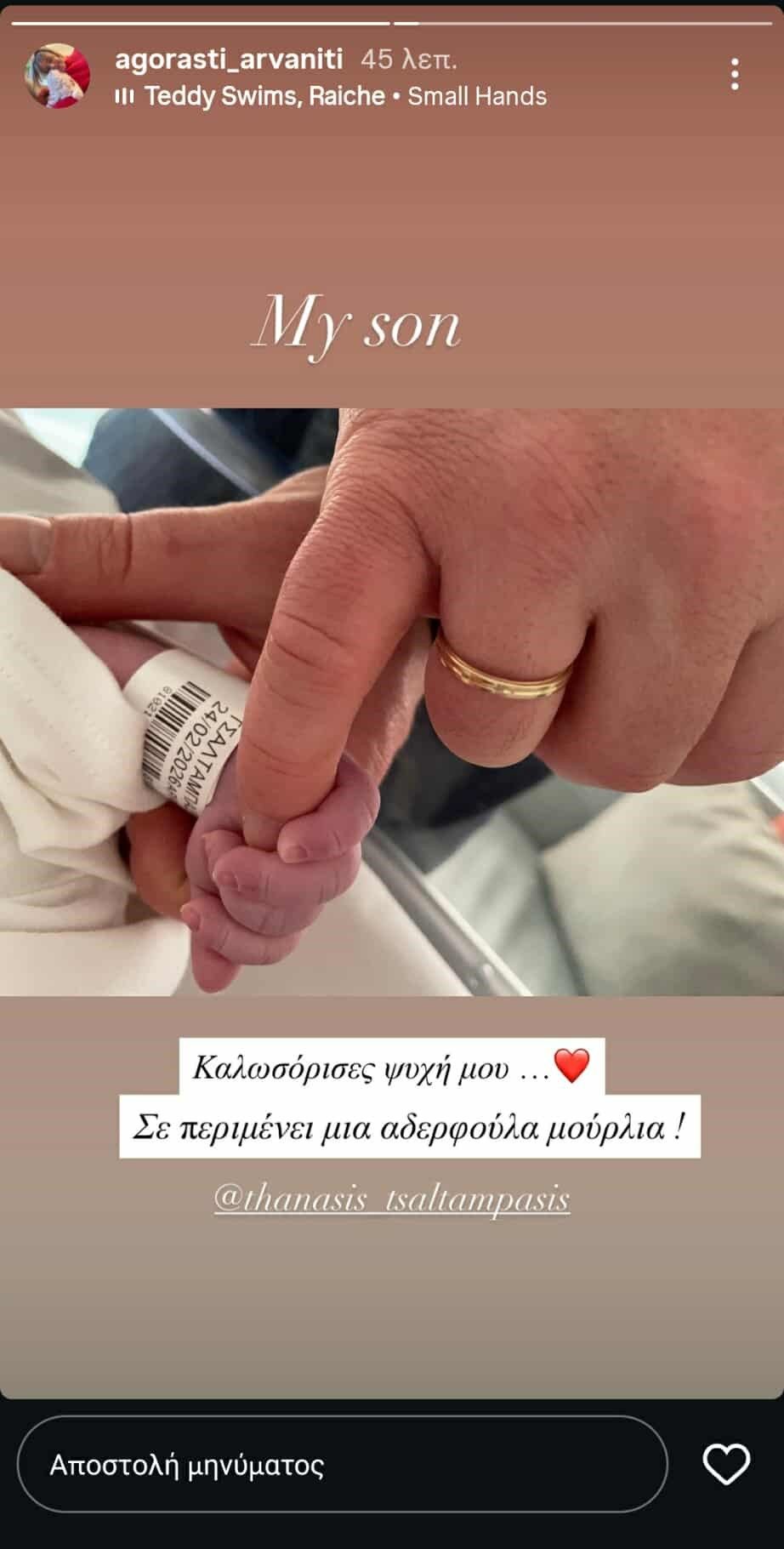 Στο τρυφερό στιγμιότυπο που ανάρτησε, ο Θανάσης Τσαλταμπάσης φαίνεται να κρατά το χεράκι του μωρού, σε μια ιδιαίτερα συγκινητική στιγμή. Στη λεζάντα της φωτογραφίας, η Αγοραστή Αρβανίτη έγραψε: «Καλωσόρισες ψυχή μου. Σε περιμένει μια αδελφή μούρλια».