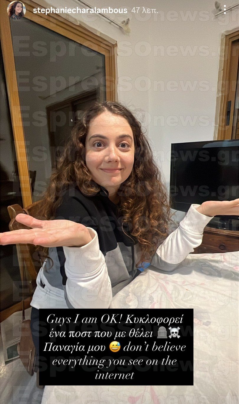 Η Στέφανη Χαραλάμπους, σοκαρισμένη από το περιεχόμενο της ανάρτησης, έσπευσε να διαψεύσει άμεσα την ψευδή είδηση μέσα από τον προσωπικό της λογαριασμό. Δημοσίευσε φωτογραφία της και με εμφανή αγωνία έγραψε: «Παιδιά είμαι μια χαρά! Κυκλοφορεί ένα ποστ που με θέλει νεκρή Παναγία μου. Μην πιστεύετε τα πάντα που βλέπετε στο ίντερνετ».