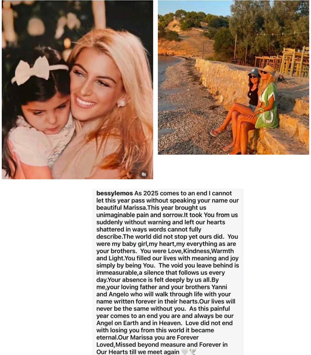 Με τα δικά της λόγια, η ηθοποιός εκφράζει όλο τον πόνο και την αγάπη της για την Μαρίσσα:”Καθώς το 2025 φτάνει στο τέλος του, δεν μπορώ να αφήσω αυτή τη χρονιά να περάσει χωρίς να προφέρω το όνομά σου, η όμορφη μας Μαρίσα. Αυτή η χρονιά μάς έφερε πόνο και θλίψη που δεν μπορούσαμε ποτέ να φανταστούμε. Σε πήρε από κοντά μας ξαφνικά, χωρίς καμία προειδοποίηση, και άφησε τις καρδιές μας κομματιασμένες με τρόπους που τα λόγια δεν μπορούν να περιγράψουν πλήρως. Ο κόσμος δεν σταμάτησε, όμως ο δικός μας σταμάτησε.Ήσουν το κοριτσάκι μου, η καρδιά μου, τα πάντα για μένα, όπως και τα αδέλφια σου. Ήσουν Αγάπη, Καλοσύνη, Ζεστασιά και Φως. Γέμιζες τη ζωή μας με νόημα και χαρά απλώς και μόνο με το να είσαι εσύ. Το κενό που αφήνεις πίσω σου είναι ανυπολόγιστο, μια σιωπή που μας ακολουθεί κάθε μέρα. Η απουσία σου γίνεται βαθιά αισθητή από όλους μας. Από μένα, τον πατέρα σου που σε αγαπά, και από τα αδέλφια σου, τον Γιάννη και τον Άγγελο, που θα περπατούν στη ζωή έχοντας το όνομά σου γραμμένο για πάντα στις καρδιές τους.Η ζωή μας δεν θα είναι ποτέ ξανά η ίδια χωρίς εσένα. Καθώς αυτή η οδυνηρή χρονιά φτάνει στο τέλος της, είσαι και θα είσαι για πάντα ο Άγγελός μας στη Γη και στον Ουρανό. Η αγάπη δεν τελείωσε με το ότι σε χάσαμε από αυτόν τον κόσμο· έγινε αιώνια. Μαρίσσα μας, θα είσαι για πάντα Αγαπημένη, Απερίγραπτα Μας Λείπεις και για Πάντα στις Καρδιές μας, μέχρι να συναντηθούμε ξανά.”*