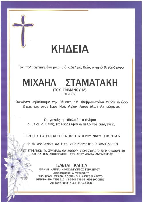 Βαρύ πένθος έχει σκορπίσει στην Αντιμάχεια και σε ολόκληρη την Κω η απώλεια του Μιχαήλ Σταματάκη, από τους Αγίους Αποστόλους Αντιμάχειας, ο οποίος έφυγε από τη ζωή σε ηλικία 52 ετών, έπειτα από αιφνίδια παθολογικά προβλήματα που αντιμετώπιζε τον τελευταίο μήνα.