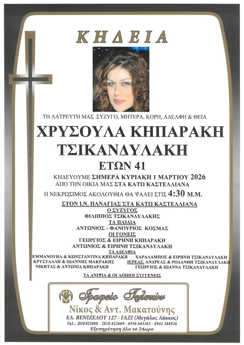 Ανείπωτο πόνο έχει σκορπίσει στα Κάτω Καστελλιανά στην Ανατολική Μεσαρά, η είδηση του πρόωρου θανάτου της Χρυσούλας Κηπαράκη-Τσικανδυλάκη, η οποία έφυγε από τη ζωή σε ηλικία μόλις 41 ετών.